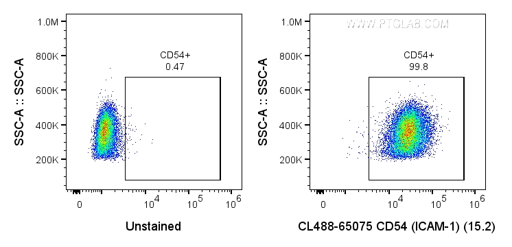 CL488-65075 targets ICAM-1/CD54 in FC applications and shows reactivity with human samples.