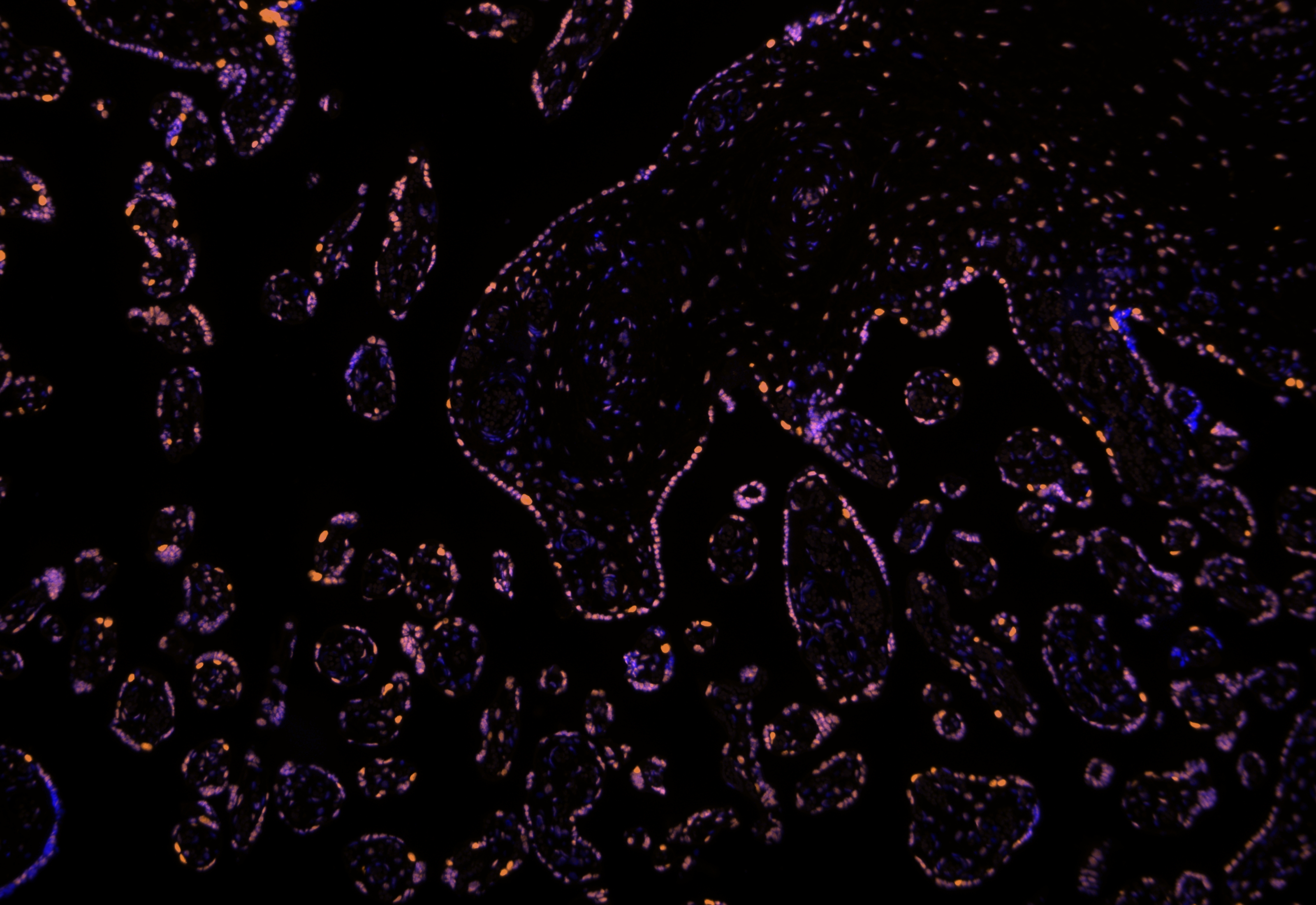 1. TSA染色完成后,用新鲜ddH2O冲洗载玻片上的TSA染料,将切片用新鲜ddH2O润洗2遍。再将切片用 1x TBST润洗1遍,将~100 uL(体积取决于组织的大小)DAPI染料滴加在载玻片上,覆盖整个组织。