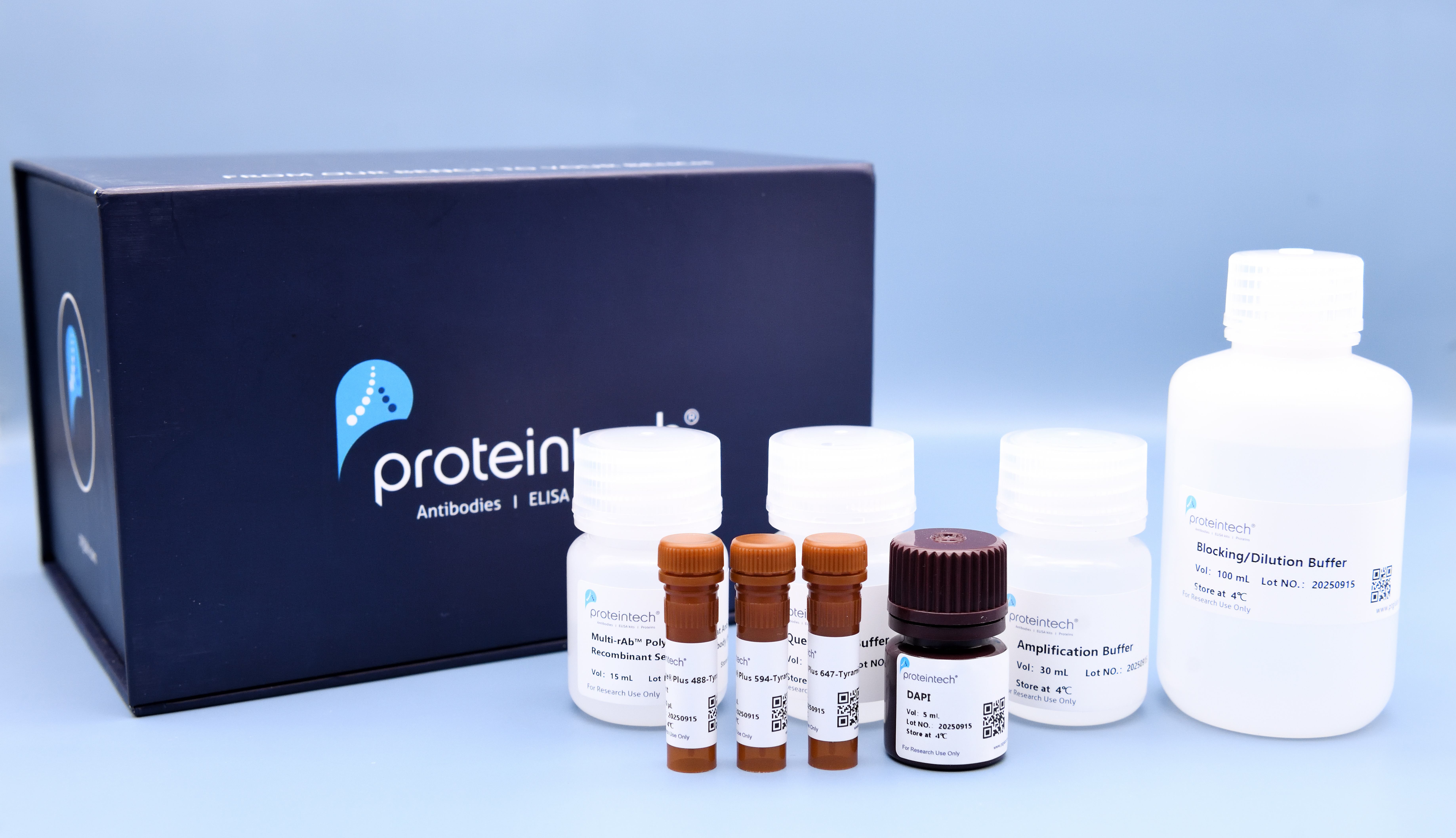 本产品提供了多聚物HRP标记的抗兔重组二抗和3种TSA染料和其他主要试剂,可以配合兔源一抗进行多重荧光染色(最多3标4色),产品结合了重组二抗和自研TSA染料优势,无需复杂优化即可以轻松得到显著荧光信号。