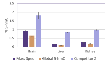 Genomic DNA samples from human tissues were analyzed for % 5-hmC using either mass spectrometry, Active Motif's Global 5-hmC DNA ELISA Kit or Competitor Z's Global 5-hmC ELISA Kit. Each method was performed as recommended by the manufacturer. The % 5-hmC was then plotted for comparison. Active Motif's Global 5-hmC DNA ELISA Kit produced results most similar to mass spectrometry analysis, while Competitor Z's quantification showed significant differences from the mass spectrometry values.