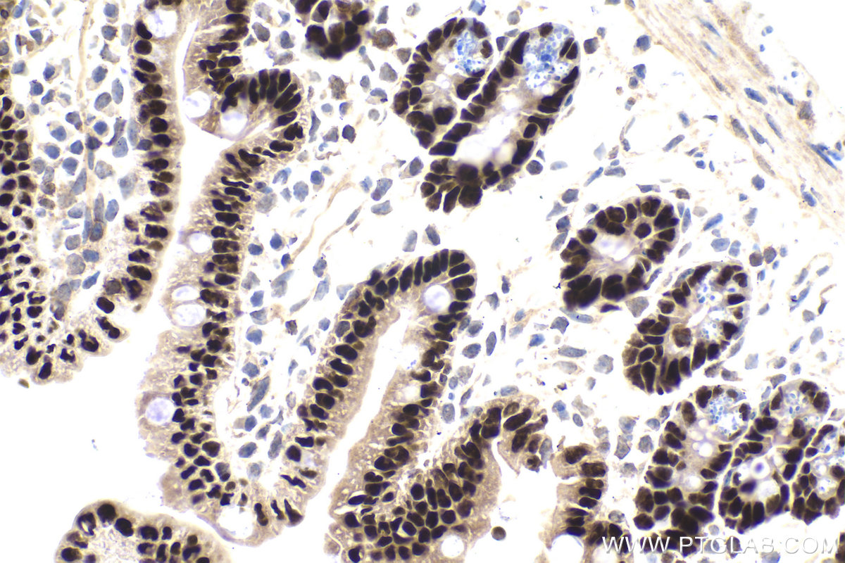 CDX2, also named as Homeobox protein CDX-2, is a 313 amino acid protein, which contains one homeobox DNA-binding domain and belongs to the Caudal homeobox family. CDX2 localizes in the nucleus and is involved in the transcriptional regulation of multiple genes expression in the intestinal epithelium. The relative expression of CDX1 to CDX2 protein may be important in the anterior to posterior patterning of the intestinal epithelium and in defining patterns of proliferation and differentiation along the crypt-villus axis. Both Cdx1 and Cdx2 genes must be expressed to reduce tumorigenic potential, to increase sensitivity to apoptosis, and to reduce cell migration, suggesting that the two genes control the normal phenotype by independent pathways.