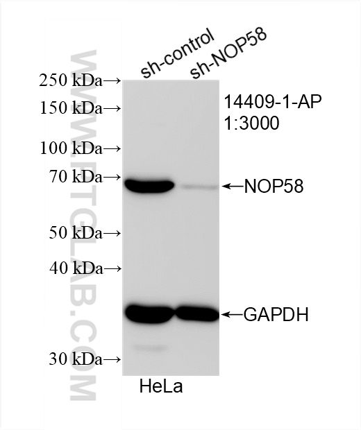 14409-1-AP targets NOP58 in WB, IHC, IF, IP, CoIP, RIP, ELISA applications and shows reactivity with human, mouse, rat samples.