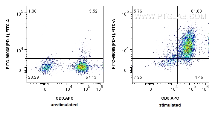 FITC-98068 targets PD-1/CD279 in FC applications and shows reactivity with human samples.