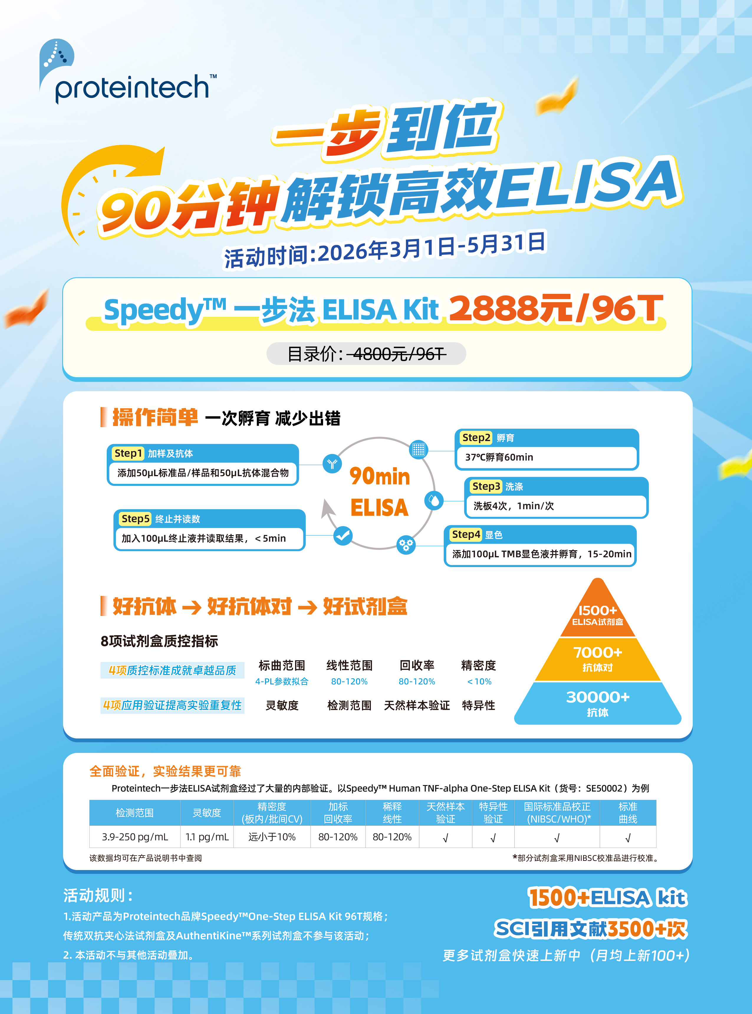 1.活动产品为Proteintech品牌Speedy™ One-Step ELISA Kit 96T规格;传统双抗夹心法试剂盒及AuthentiKine™系列试剂盒不参与该活动;