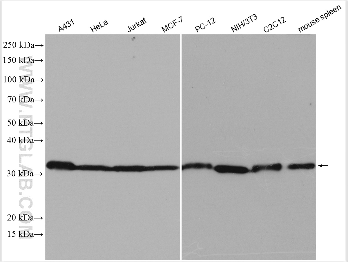 | Positive WB detected in | HeLa cells, A431 cells, BALB/3T3 clone A31 cells, HEK293 cells, Jurkat cells, MCF-7 cells, PC-12 cells, NIH/3T3 cells, C2C12 cells, mouse spleen tissue, rat spleen tissue |