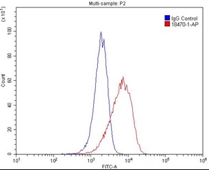 Figure 2. 1X10^6 HeLa cells were stained with 0.2ug CD133 antibody (18470-1-AP, red) and control rabbit IgG antibody (blue). Fixed with 4% PFA and blocked with 3% BSA (30 min). Alexa Fluor 488-conjugated AffiniPure Goat Anti-Rabbit IgG(H+L) was applied at a dilution of 1:1500. |