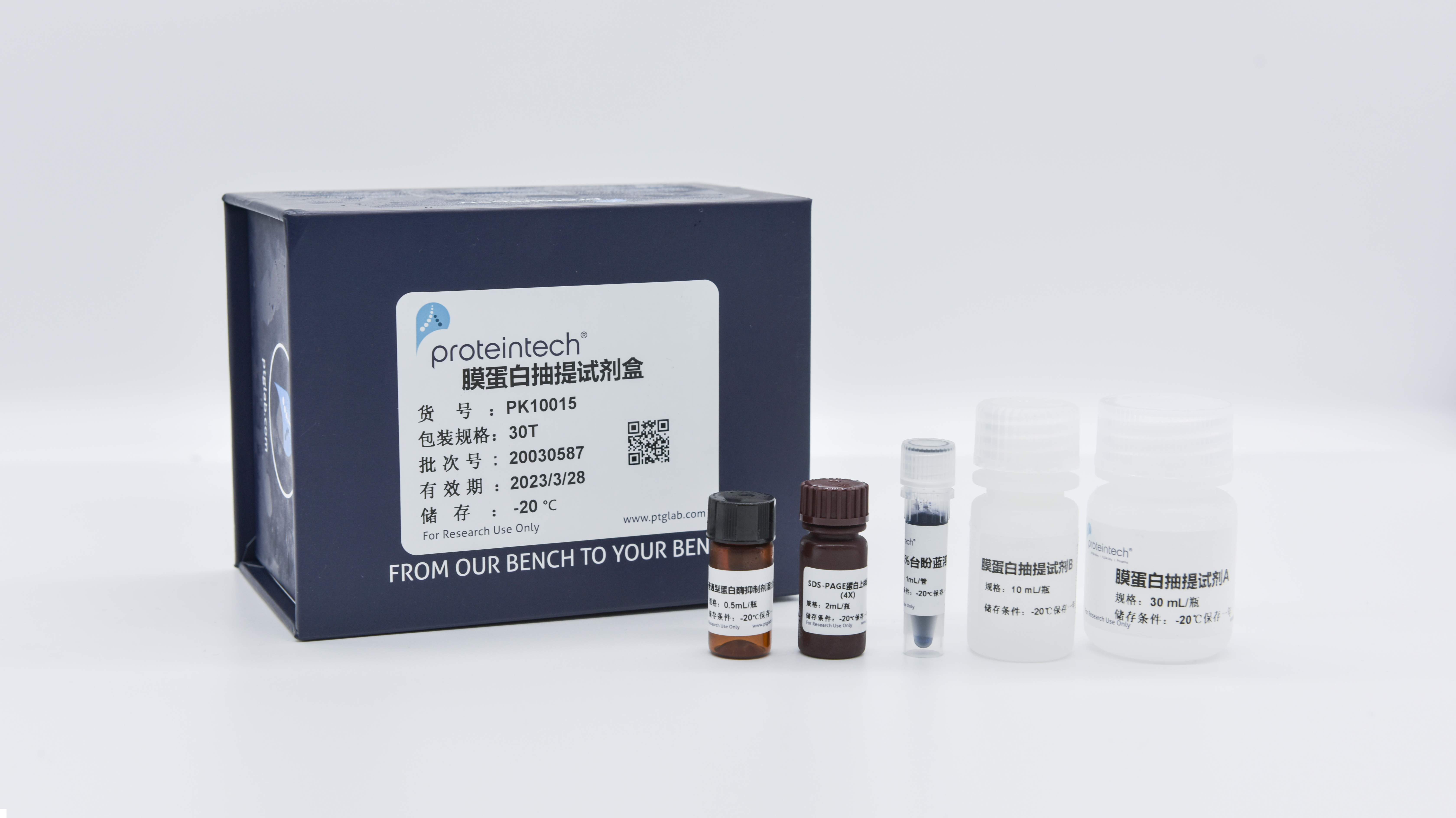 Proteintech研发的此款膜蛋白抽提试剂盒可高效的从动物组织或培养的细胞中抽提膜蛋白,抽提得到的膜蛋白不仅包含细胞膜蛋白,还包含部分亚细胞器上的膜,如:线粒体膜、内质网膜、高尔基体膜等。抽提得到的膜蛋白可用于蛋白免疫印迹,免疫沉淀等后续实验。