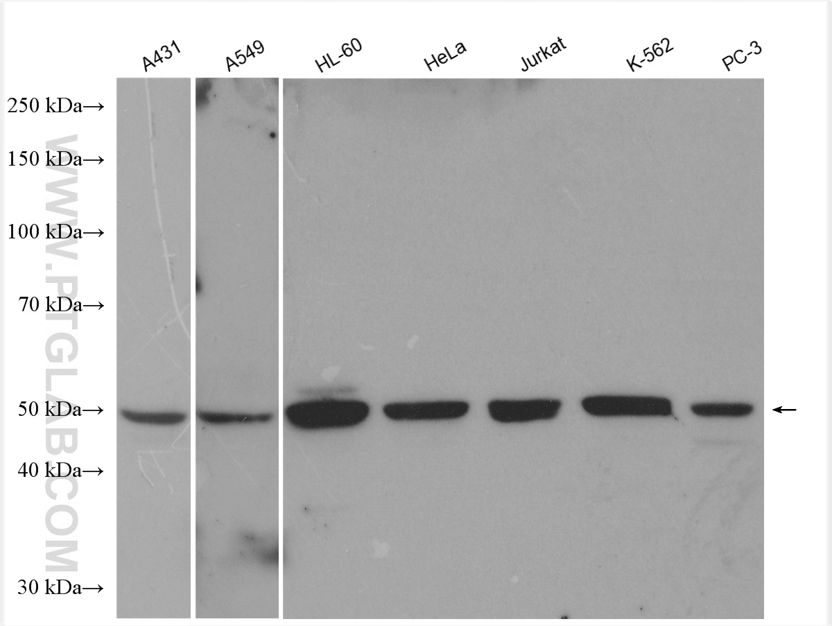 | Positive WB detected in | A431 cells, mouse spleen tissue, human liver tissue, A549 cells, HL-60 cells, HeLa cells, Jurkat cells, K-562 cells, PC-3 cells |