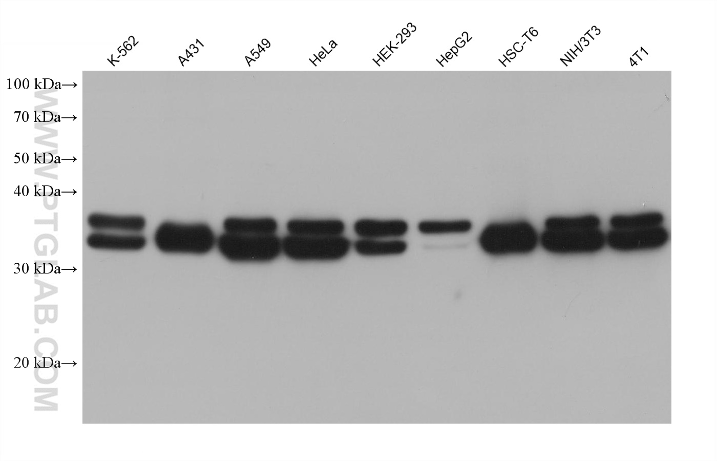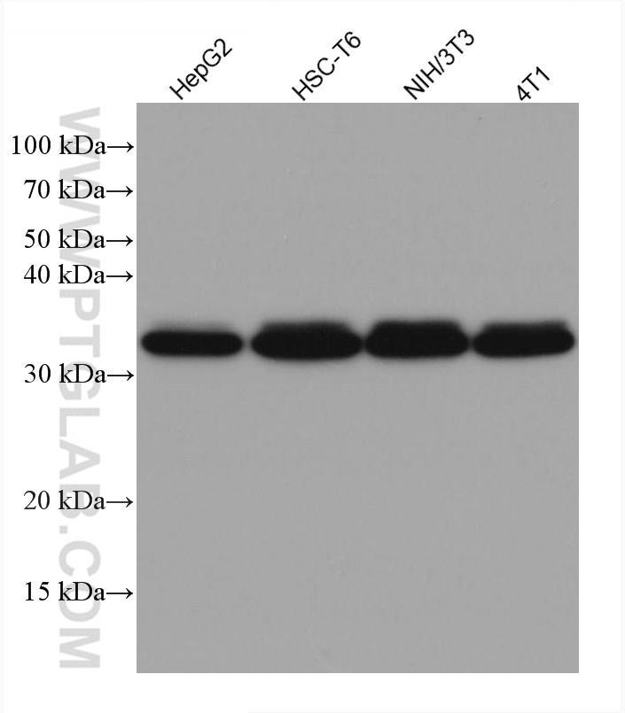 | Positive WB detected in | K-562 cells, MCF-7 cells, human brain tissue, HepG2 cells, HEK-293 cells, A549 cells, HeLa cells, A431 cells, HSC-T6 cells, NIH/3T3 cells, 4T1 cells |