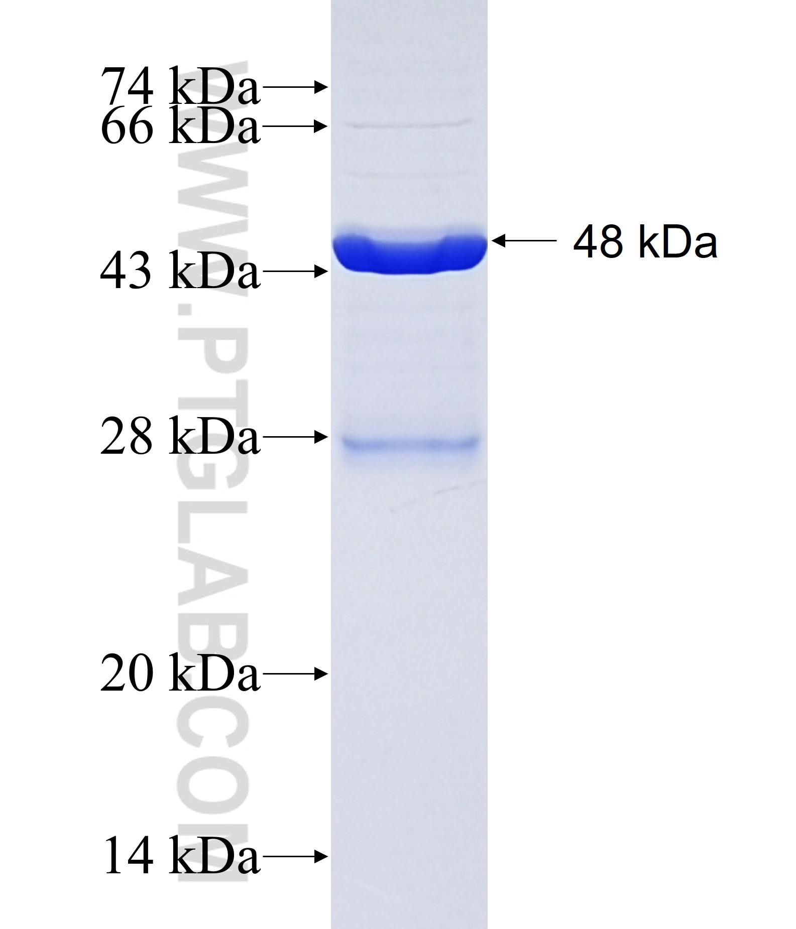 | Formulation | The purified protein was Lyophilized from sterile PBS (58mM Na2HPO4,17mM NaH2PO4, 68mM NaCl, pH8.0). 5 % trehalose and 5 % mannitol are added as protectant before lyophilization. The elution buffer contain 100mM GSH. |