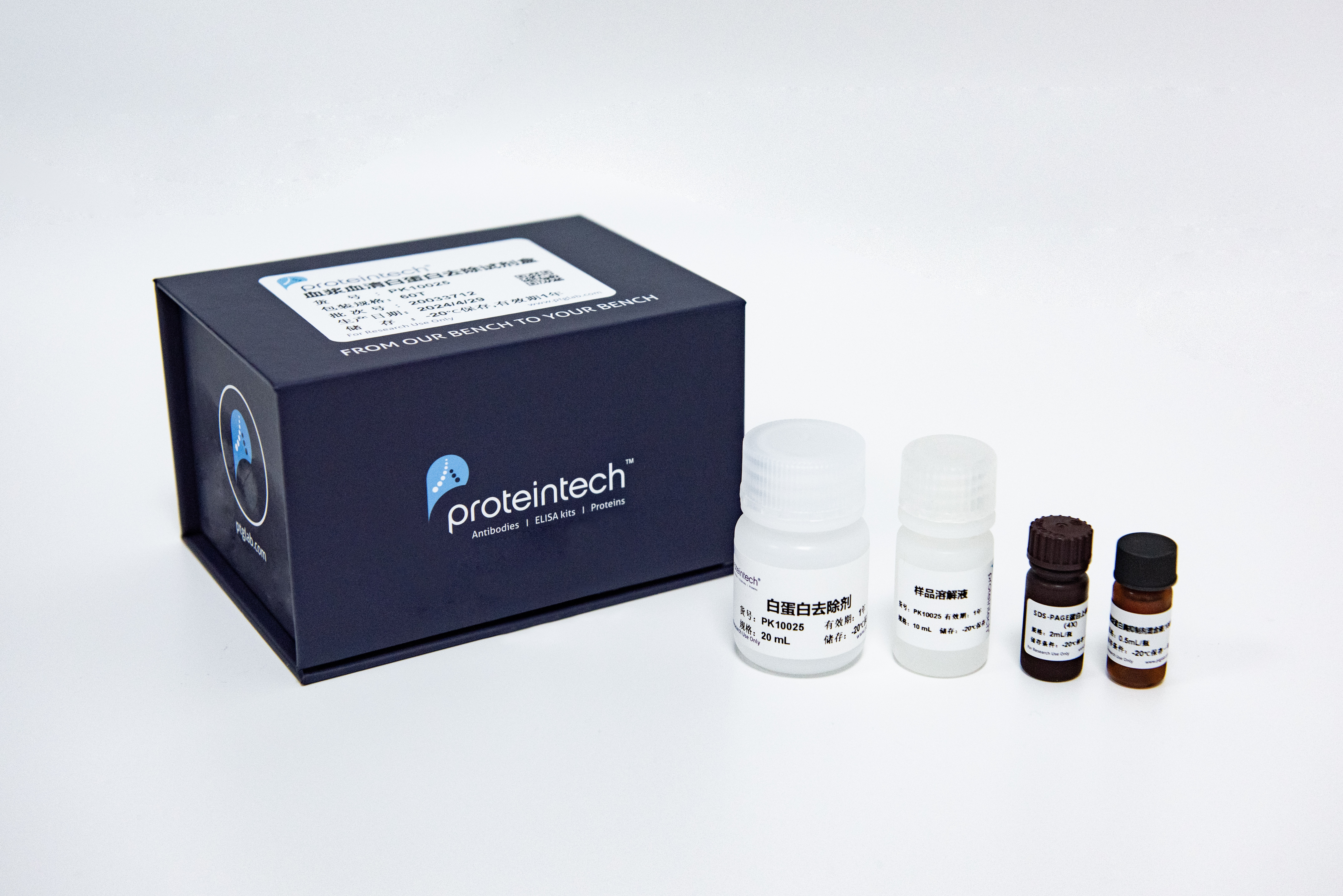 血清和血浆是研究人/动物蛋白质组的重要样本。然而,大量白蛋白的存在干扰了许多检测和功能蛋白质组学分析。血清白蛋白占总血清蛋白的60%左右,对其它低丰度蛋白的检测造成了极大的干扰。因此,有效去除占血清白蛋白是更好地鉴定其他的蛋白的先决条件之一。使用本试剂可有效去除白蛋白,提高检测的灵敏度。Proteintech血浆血清白蛋白去除试剂盒可以处理几微升到几毫升的样品,适用于各类种属的血浆血清,一次可以去除90%以上的白蛋白。去除白蛋白后的样品可用于蛋白免疫印迹、免疫沉淀、ELISA等蛋白分析实验。
