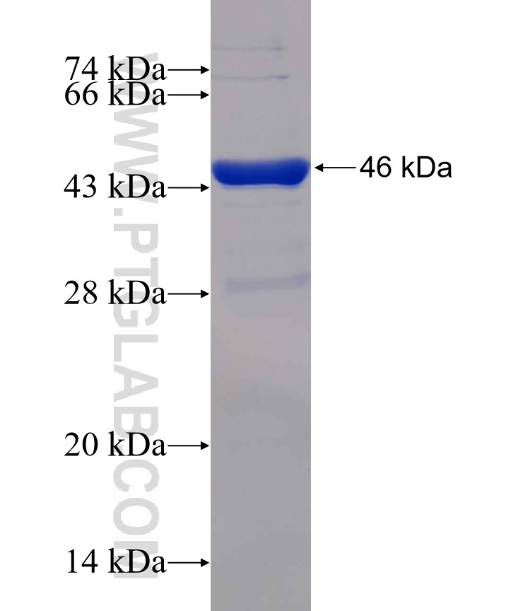 | Formulation | The purified protein was Lyophilized from sterile PBS (58mM Na2HPO4,17mM NaH2PO4, 68mM NaCl, pH8.0). 5 % trehalose and 5 % mannitol are added as protectant before lyophilization. The elution buffer contain 100mM GSH. |