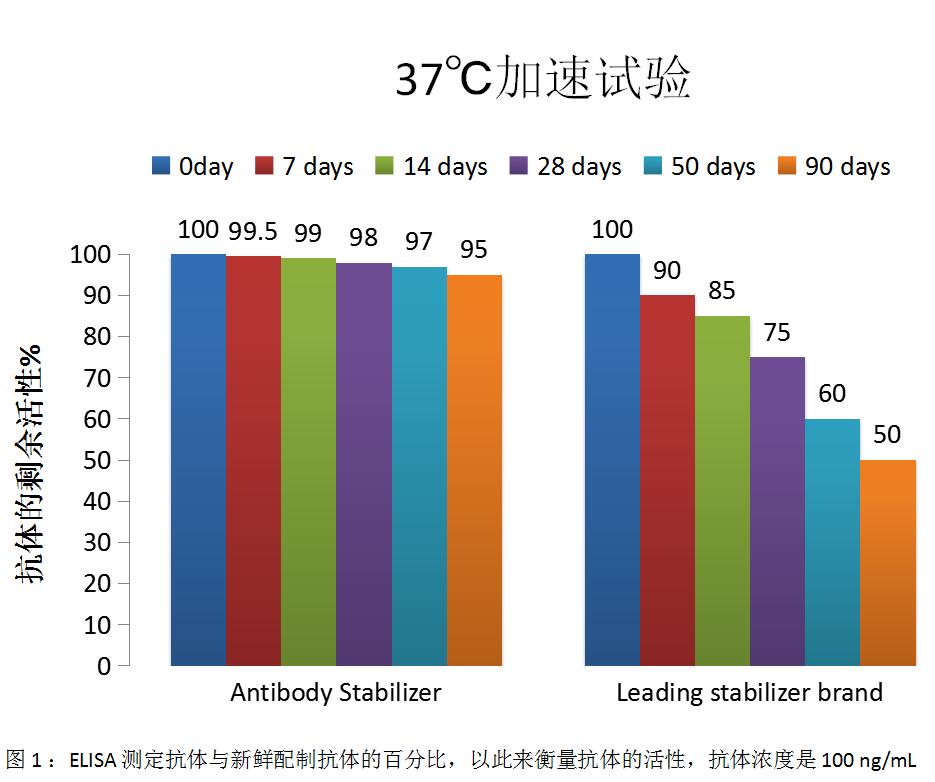 测试 Antibody Stabilizer 稳定性强度。图中所示为低浓度抗体保存在 37°C活性变化。抗体分别保存于Proteintech公司研制的 Antibody Stabilizer 和目前市面上领先的一款稳定剂产品。37°C保存 90天后,在 ELISA 实验中检测抗体保留的结合活性。37°C保存 30天后,用 Proteintech公司研制的 Antibody Stabilizer 保存的抗体结合活性仍有 95%左右。这说明抗体在 Antibody Stabilizer 中, 4°C至少可以保存 3年,并保持95%的结合活性(根据 Arrhenius公式)。