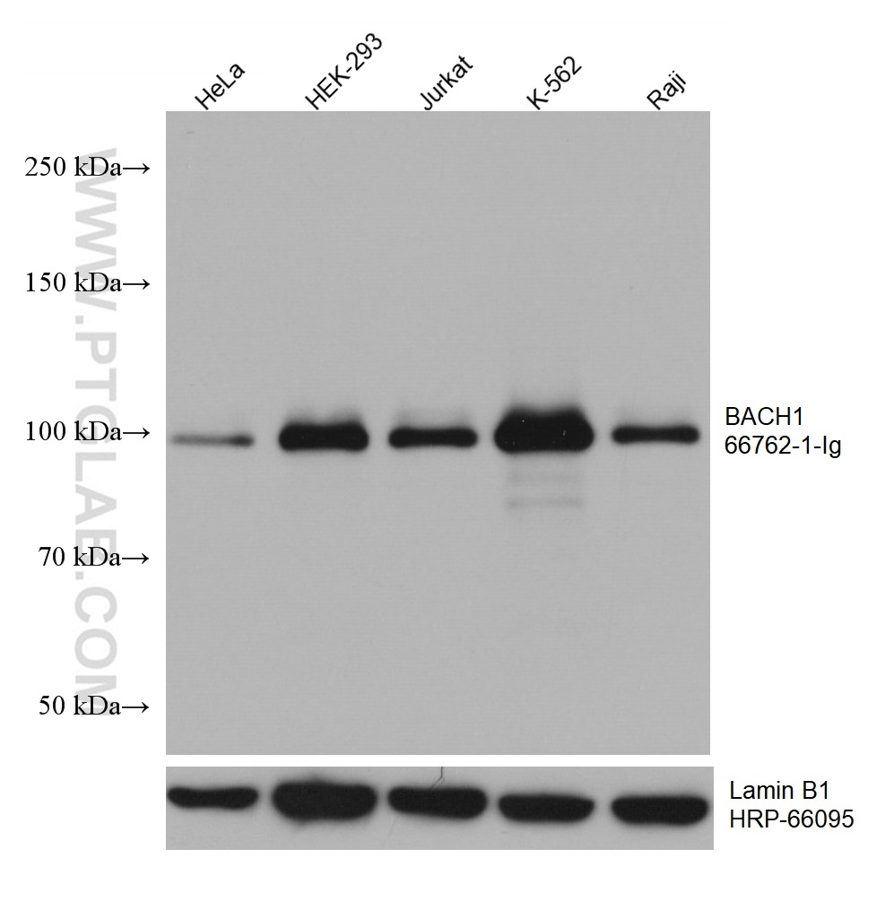 BTB and CNC homology 1, basic leucine zipper transcription factor 1(BACH1) is a heme-regulated transcriptional regulator that acts as a repressor or activator and a member of the AP-a superfamily. MafK belongs to the small Maf family that can function as transcriptional activators or repressors depending on the proteins with which they form heterodimers. BACH1 has crucial roles in both stress responses and transformation by H-RasV12. The molecular weight of expected mobility Bach1 is 100-110 kDa.