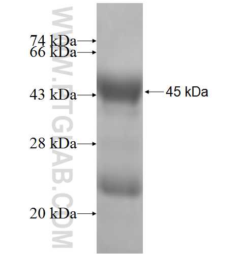 Formulation The protein was expressed as GST-tagged fusion protein by E.Coli and purified by Glutathione-sepharose. The purified protein was resolved in PBS (58mM Na2HPO4,17mM NaH2PO4, 68mM NaCl, pH8.0 ) added with 15% glycerol. The elution buffer contain 100mM GSH.