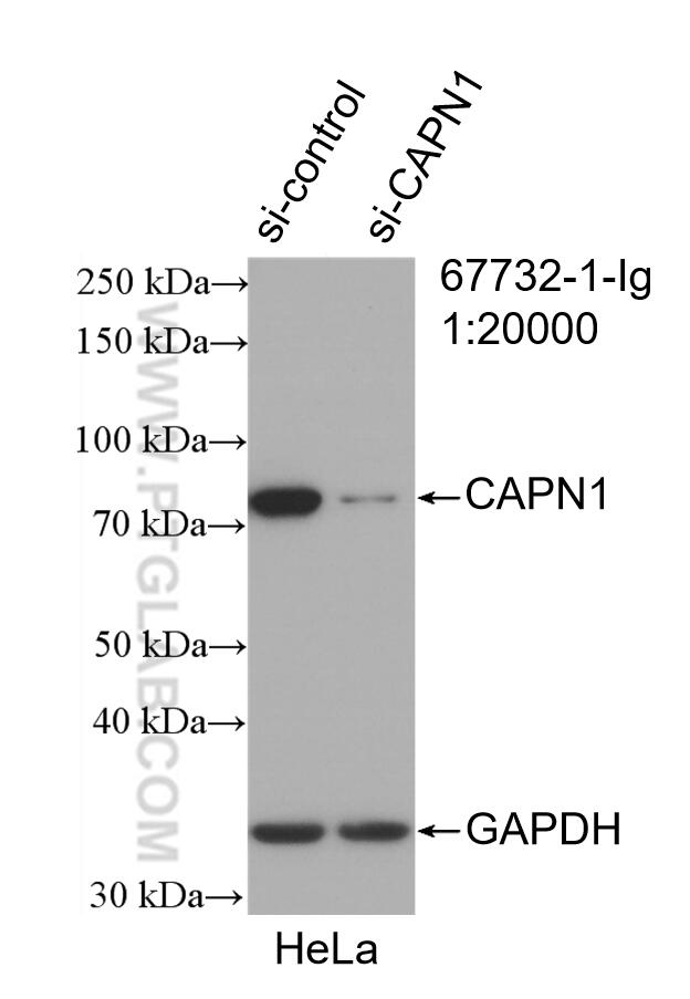 67732-1-PBS targets CAPN1 in WB, IHC, Indirect ELISA applications and shows reactivity with Human samples.