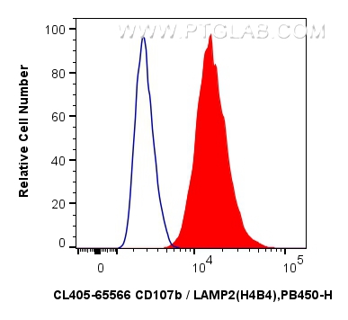 CL405-65566 targets CD107b / LAMP2 in FC (Intra) applications and shows reactivity with human samples.