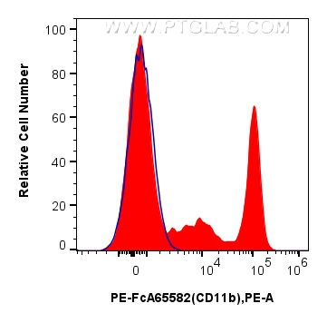 PE-FcA65582 targets CD11b in FC applications and shows reactivity with human samples.