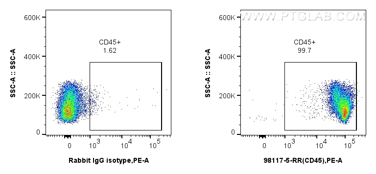 98117-5-RR targets CD45 in FC applications and shows reactivity with human, monkey, non-human primates samples.