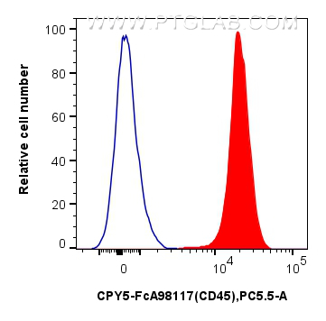 CPY5-FcA98117 targets CD45 in FC applications and shows reactivity with human samples.