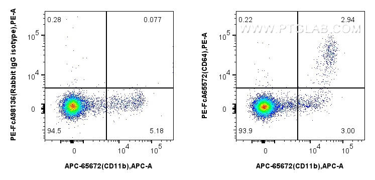 PE-FcA65572 targets CD64 in FC applications and shows reactivity with human, monkey, non-human primates samples.