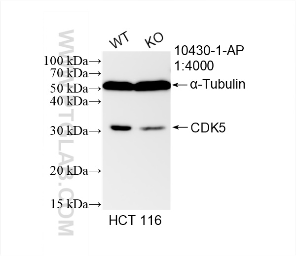 | Positive WB detected in | HepG2 cells, HCT 116 cells, mouse pancreas tissue, NIH/3T3 cells, WB result of CDK5 antibody (10430-1-AP; 1:1000; room temperature for 1.5 hours) with wild-type and CDK5 knockout HCT 116 cells., mouse brain tissue |