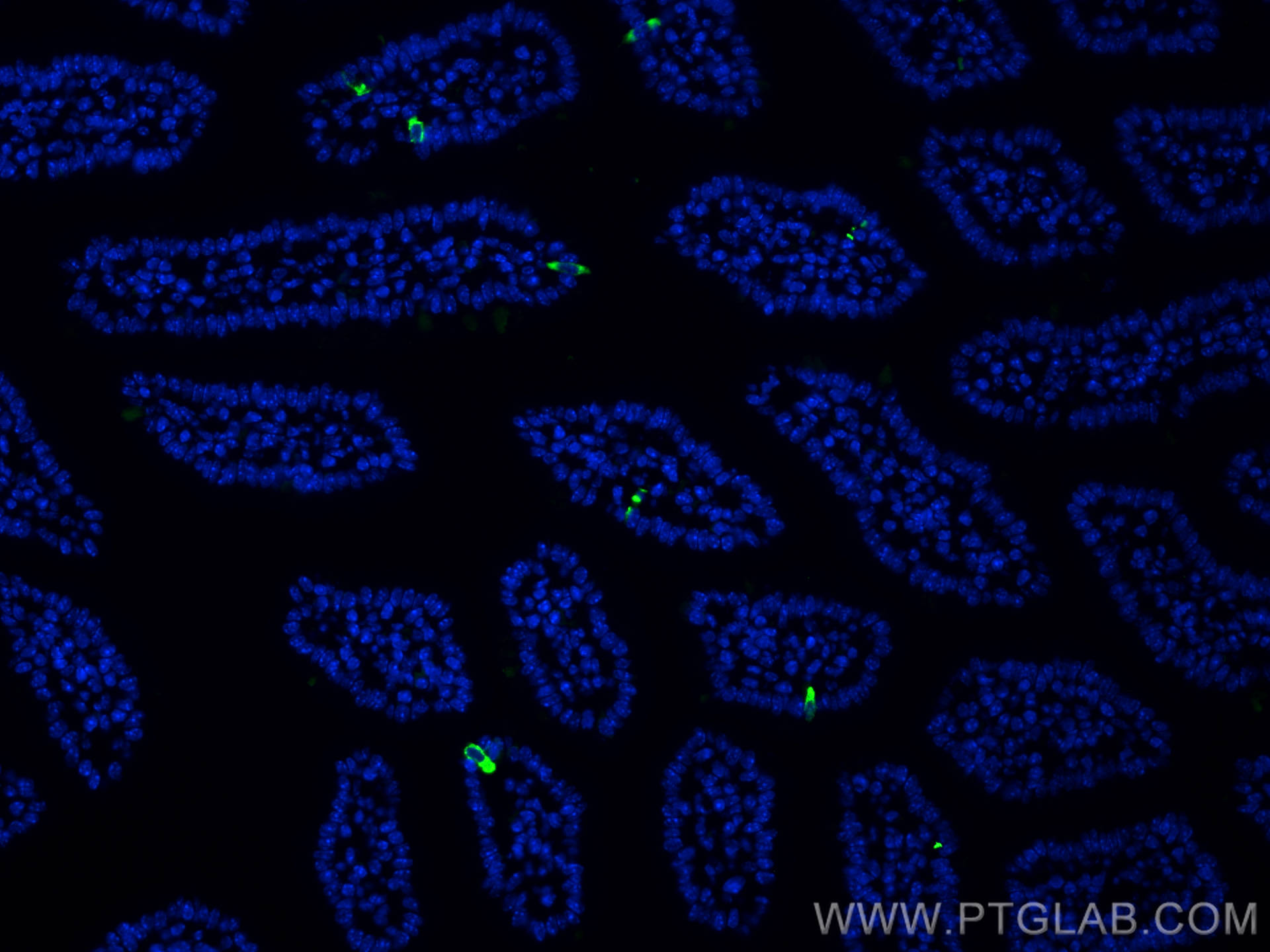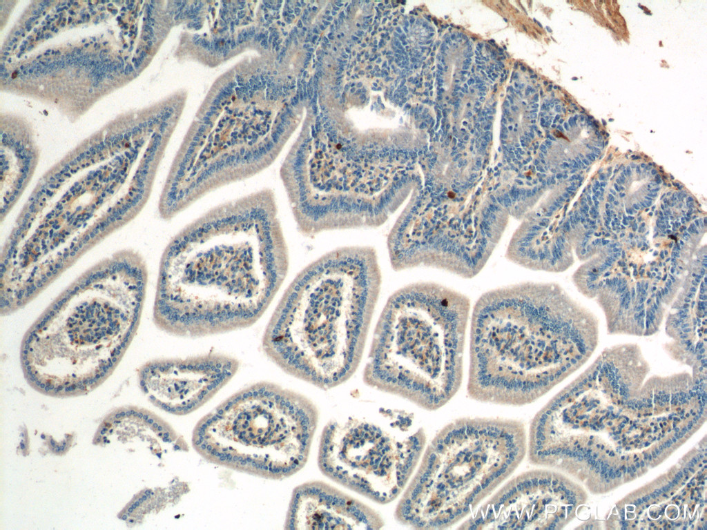 Immunohistochemical analysis of paraffin-embedded human small intestine using 23342-1-AP (Chromogranin A antibody) at dilution of 1:800 (under 10x lens).