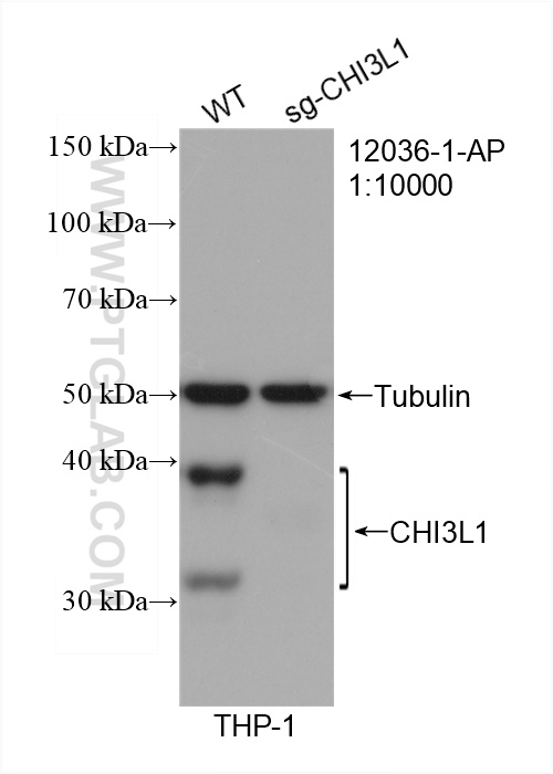12036-1-AP targets CHI3L1/YKL40 in WB, IHC, IF/ICC, IF-P, IP, ELISA applications and shows reactivity with human, mouse samples.