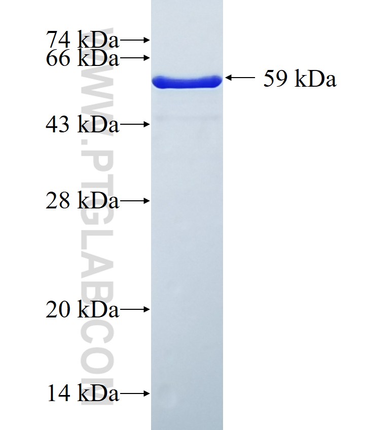 | Formulation | The purified protein was Lyophilized from sterile PBS (58mM Na2HPO4,17mM NaH2PO4, 68mM NaCl, pH8.0). 5 % trehalose and 5 % mannitol are added as protectant before lyophilization. The elution buffer contain 100mM GSH. |