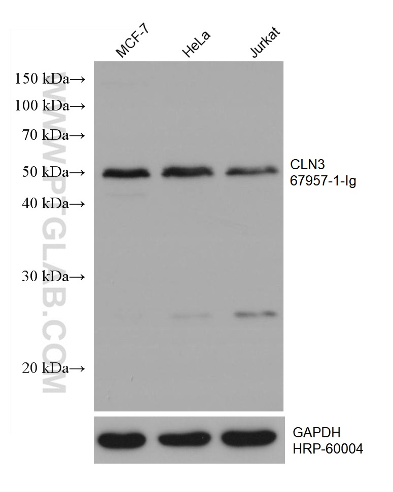 67957-1-Ig targets CLN3 in WB, ELISA applications and shows reactivity with Human samples.