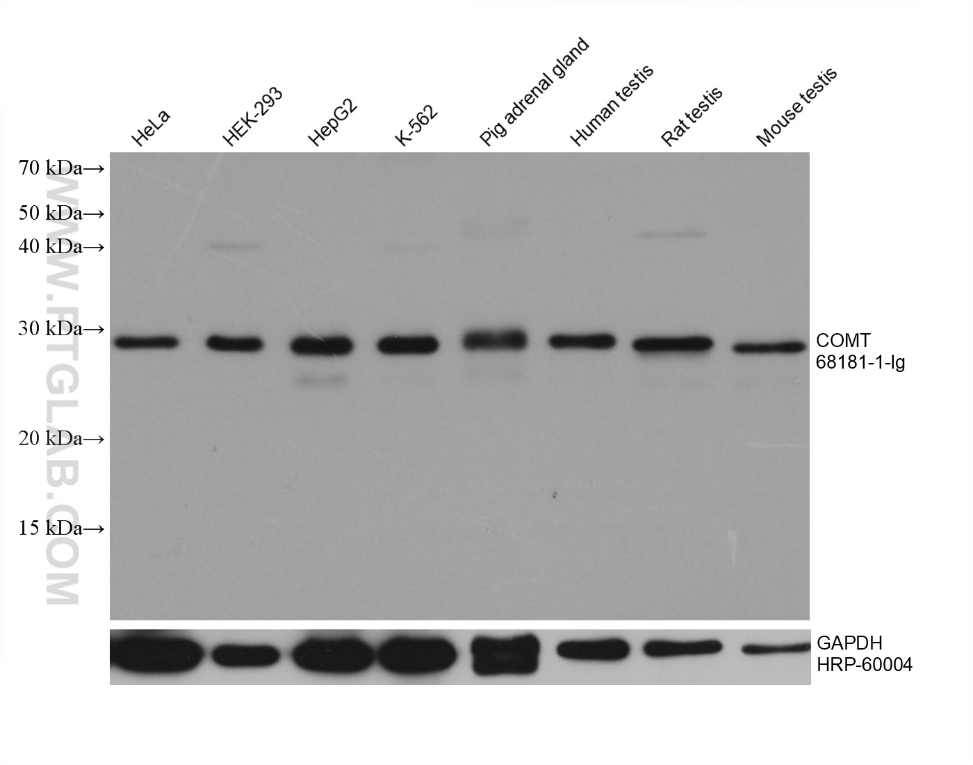 68181-1-PBS targets COMT in WB, IF-P, Indirect ELISA applications and shows reactivity with human, mouse, rat, pig samples.