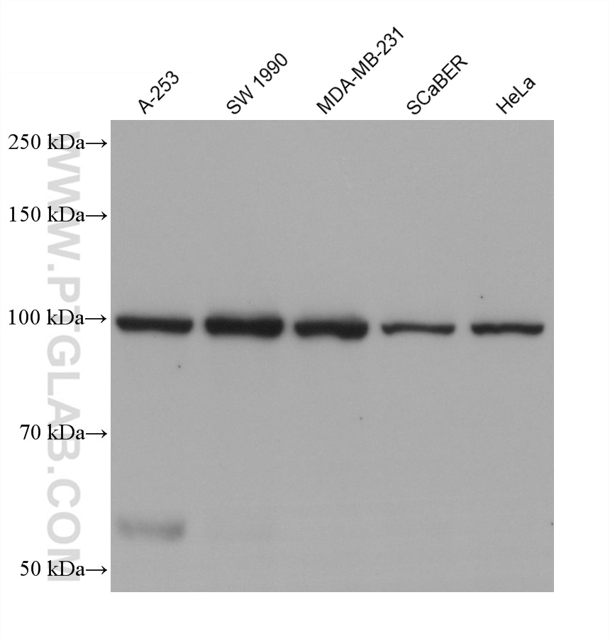 | Positive WB detected in | A-253 cells, SW 1990 cells, MDA-MB-231 cells, SCaBER cells, HeLa cells |