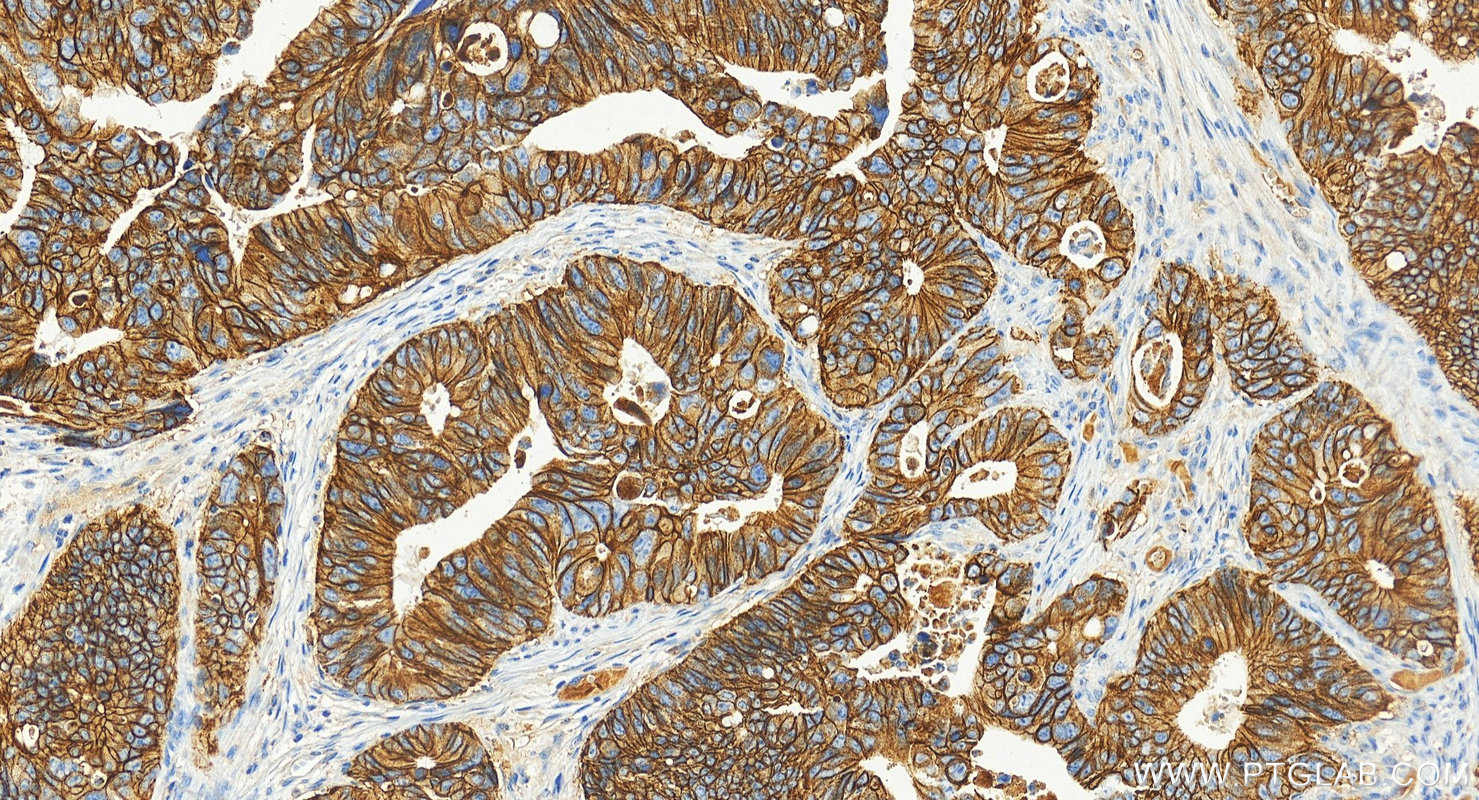 Cadherins are a family of transmembrane glycoproteins that mediate calcium-dependent cell-cell adhesion and play an important role in the maintenance of normal tissue architecture. E-cadherin (epithelial cadherin), also known as CDH1 (cadherin 1) or CAM 120/80, is a classical member of the cadherin superfamily which also include N-, P-, R-, and B-cadherins. E-cadherin is expressed on the cell surface in most epithelial tissues. The extracellular region of E-cadherin establishes calcium-dependent homophilic trans binding, providing specific interaction with adjacent cells, while the cytoplasmic domain is connected to the actin cytoskeleton through the interaction with p120-, α-, β-, and γ-catenin (plakoglobin). E-cadherin is important in the maintenance of the epithelial integrity, and is involved in mechanisms regulating proliferation, differentiation, and survival of epithelial cell. E-cadherin may also play a role in tumorigenesis. It is considered to be an invasion suppressor protein and its loss is an indicator of high tumor aggressiveness. E-cadherin is sensitive to trypsin digestion in the absence of Ca2+.