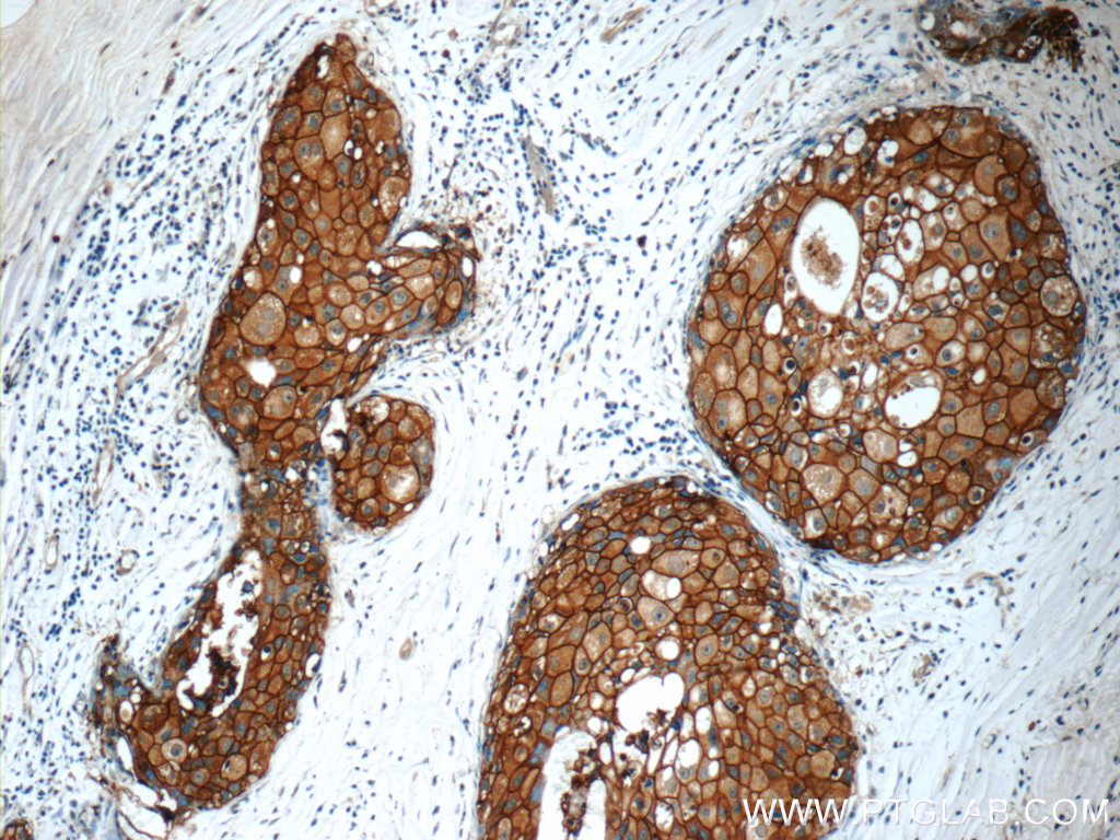 Immunohistochemical analysis of paraffin-embedded human breast cancer tissue slide using 51105-1-AP (HER2/ErbB2 antibody at dilution of 1:50 (under 10x lens).