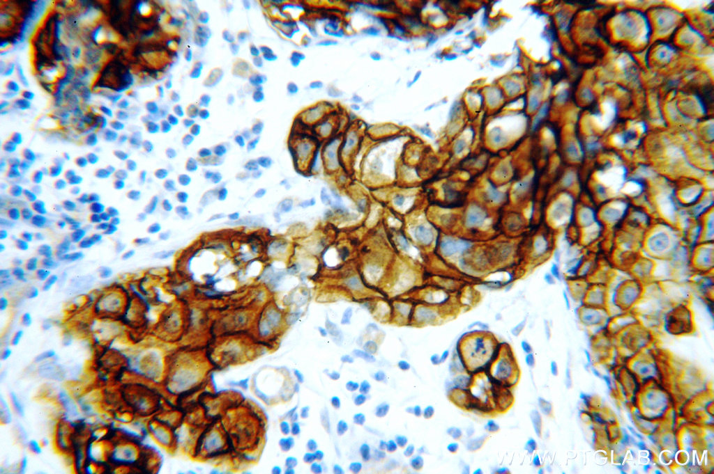 Immunohistochemical analysis of paraffin-embedded human breast cancer tissue slide using 51105-1-AP (HER2/ErbB2 antibody at dilution of 1:50 (under 40x lens).