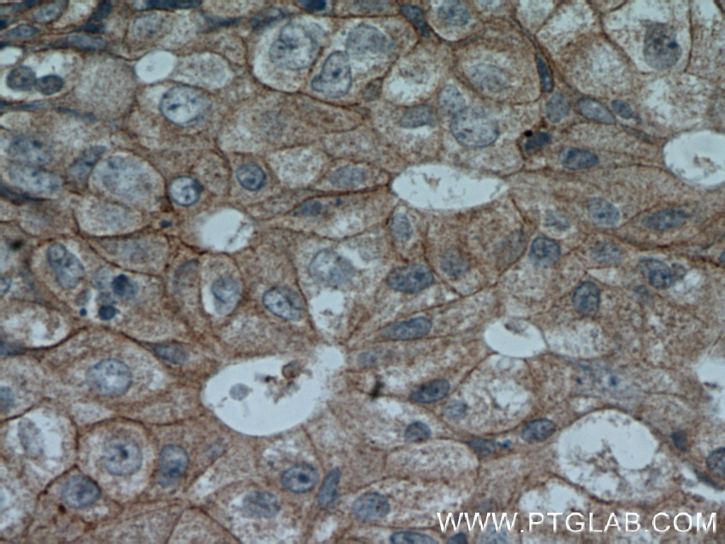 Immunohistochemical analysis of paraffin-embedded human breast cancer using 51105-1-AP (HER2/ErbB2 antibody) at dilution of 1:50 (under 10x lens).
