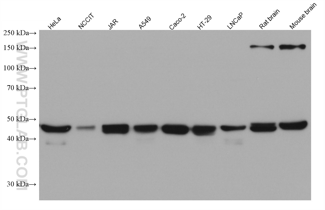 | Positive WB detected in | HEK-293 cells, HeLa cells, NCCIT cells, JAR cells, A549 cells, Caco-2 cells, LNCaP cells, HT-29 cells, Rat brain tissue, Mouse brain tissue |