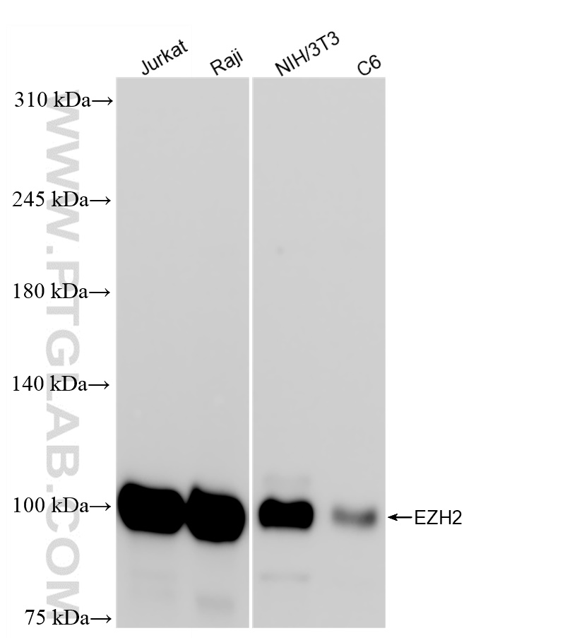 EZH2 (enhancer of zeste homologue 2, also known as KMT6) is a member of Polycomb group (PcG) family and encodes a histone methyl transferase that has an essential role in promoting histone H3 lysine 27 trimethylation (H3K27me3) and epigenetic gene silencing. EZH2 is important for cell proliferation and inhibition of cell differentiation, and is implicated in cancer progression. Overexpression of EZH2 is a marker of advanced and metastatic disease in many solid tumors, including prostate and breast cancer. This antibody detected EZH2 protein as a single band with a molecular weight (MW) of 91-100 kDa in multiple cell lines. The phosphorylation may result in the higher molecular weight (calculated MW as 80-86 kDa). (20935635, 21367748)