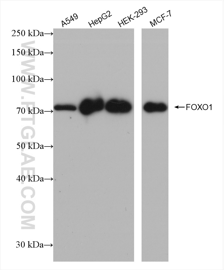 82997-1-PBS targets FOXO1 in WB, IHC, IF/ICC, FC (Intra), Indirect ELISA applications and shows reactivity with human, mouse samples.