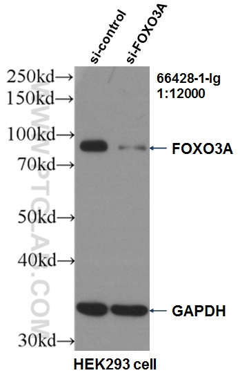 66428-1-Ig targets FOXO3A in WB, IHC, IF/ICC, IP, CoIP, ChIP, ELISA applications and shows reactivity with human, mouse, rat samples.
