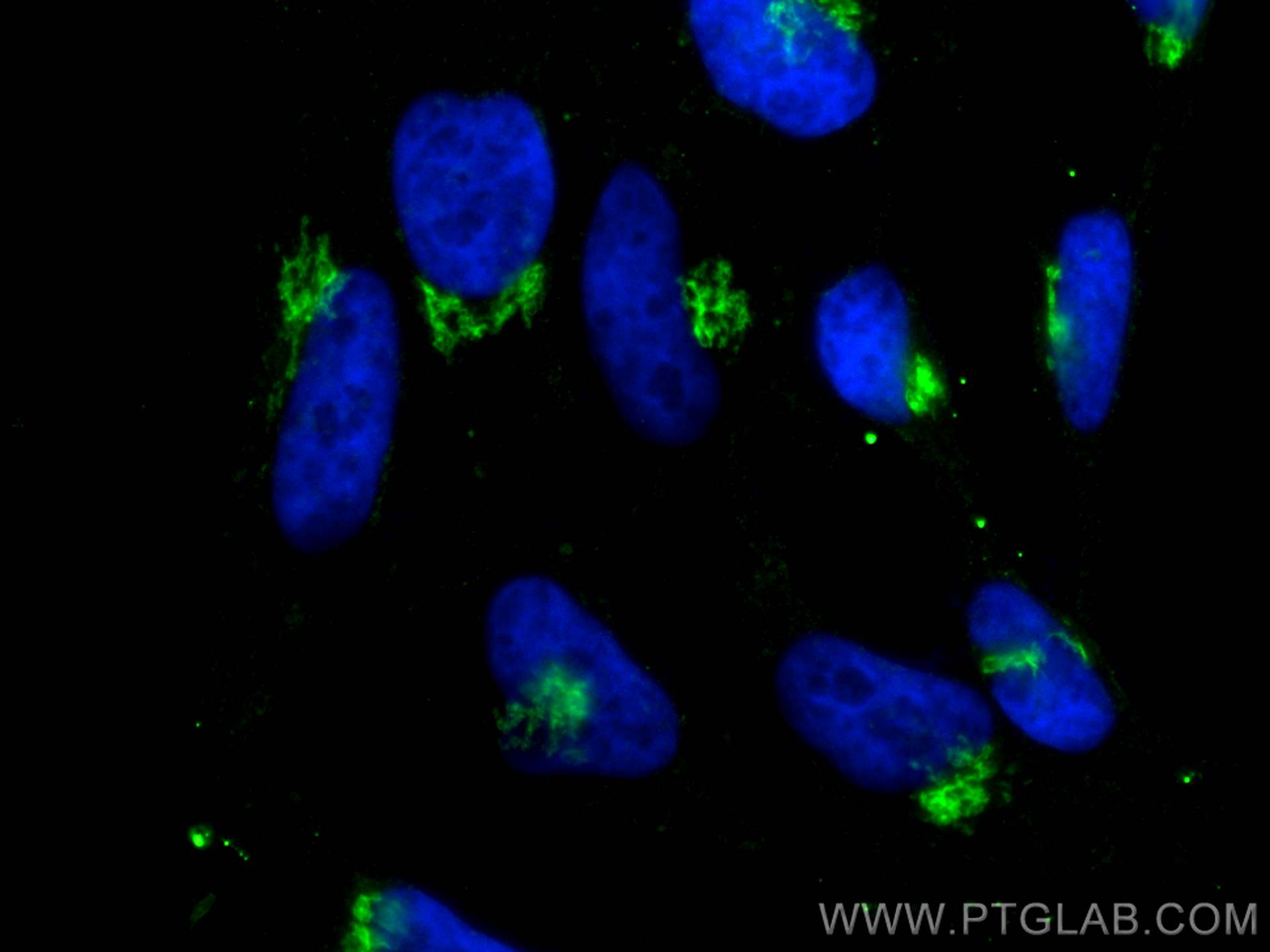 GOLGA2, also known as GM130, is a 130 kDa cis-Golgi matrix protein which is one component of the detergent and salt resistant Golgi matrix. It is a peripheral membrane protein highly bound to Golgi membrane and localized mainly at the cytoplasmic face of cis-Golgi membrane. Together with its interacting partner proteins, including p115, giantin, GRASP65, and Rab GTPase, GOLGA2/GM130 is involved in the regulation of ER-to-Golgi transport and also in the maintenance of the Golgi structure. Emerging evidence suggest that the GOLGA2/GM130 has potential roles in the control of glycosylation, cell cycle progression, and higher order cell functions such as cell polarization and directed cell migration. (PMID: 20197635)