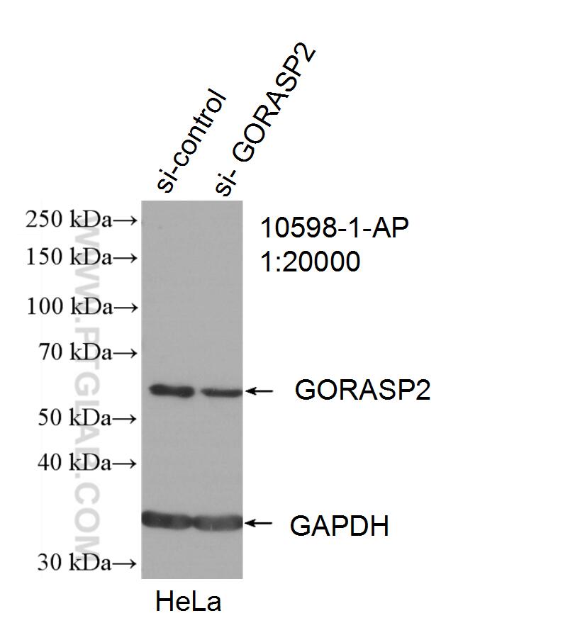 10598-1-AP targets GORASP2 in WB, IHC, IF/ICC, IP, ELISA applications and shows reactivity with human samples.