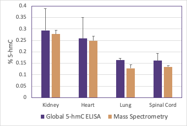 The Global 5-hmC DNA ELISA Kit was used to determine the % 5-hmC in genomic DNA isolated from human tissues. For each assay 10 ng/well of genomic DNA was used. The % 5-hmC was calculated for each sample using a standard curve generated from a serial dilution of the included 5-hmC DNA Standard. Development time was 22 minutes. The data was compared to mass spectrometry data obtained from 500 ng of the same DNA. Results show the Global 5-hmC DNA ELISA Kit provides equivalent quantification to mass spectrometry, while requiring only a fraction of the starting material.