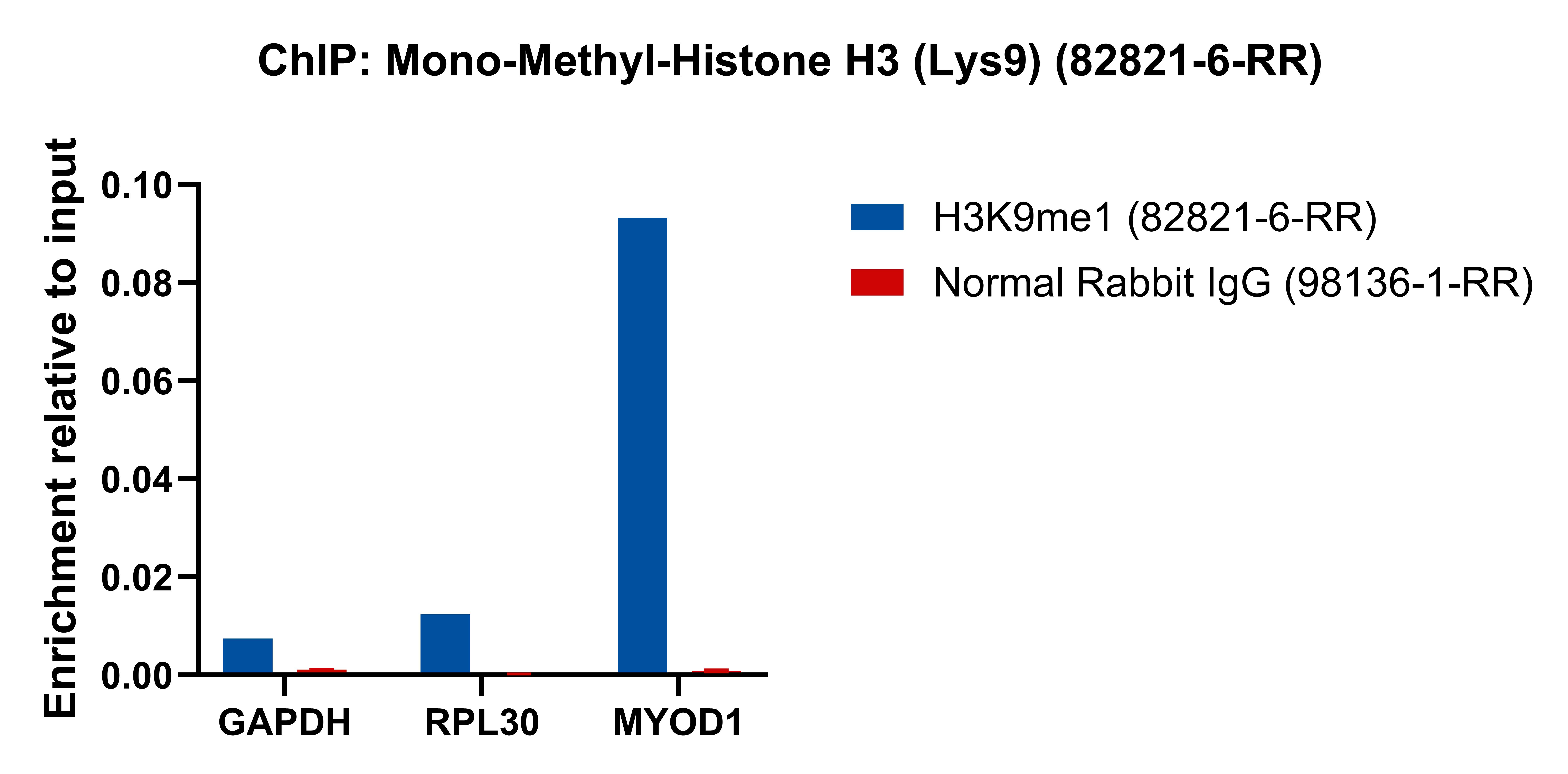 82821-6-PBS targets Mono-Methyl-Histone H3 (Lys9) in WB, Dot Blot, Indirect ELISA, ChIP-qPCR applications and shows reactivity with human, rat samples.