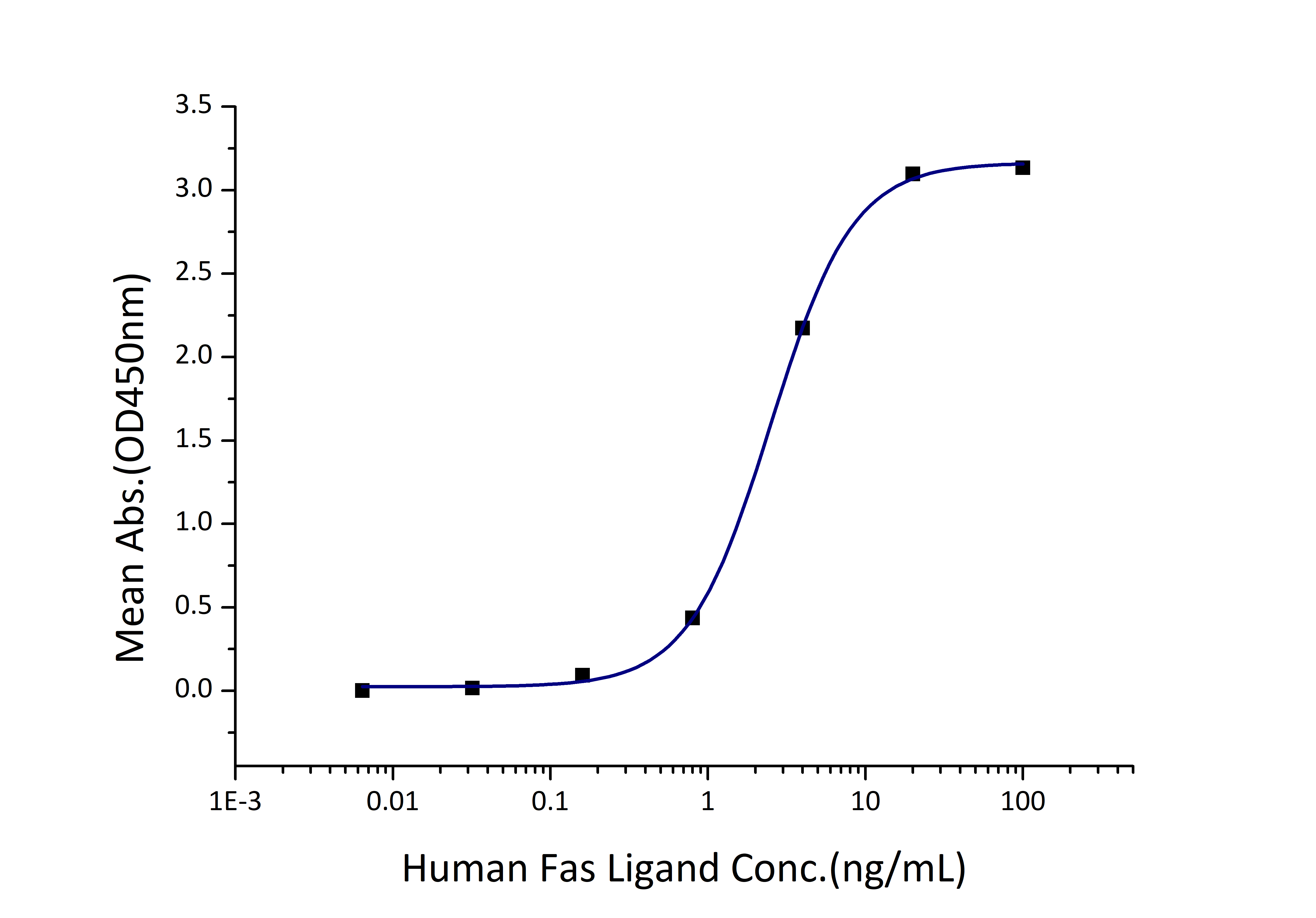 Immobilized Human Fas (His tag) at 2 μg/mL (100 μL/well) can bind Human Fas Ligand (hFc tag) with a linear range of 1-5 ng/mL. |