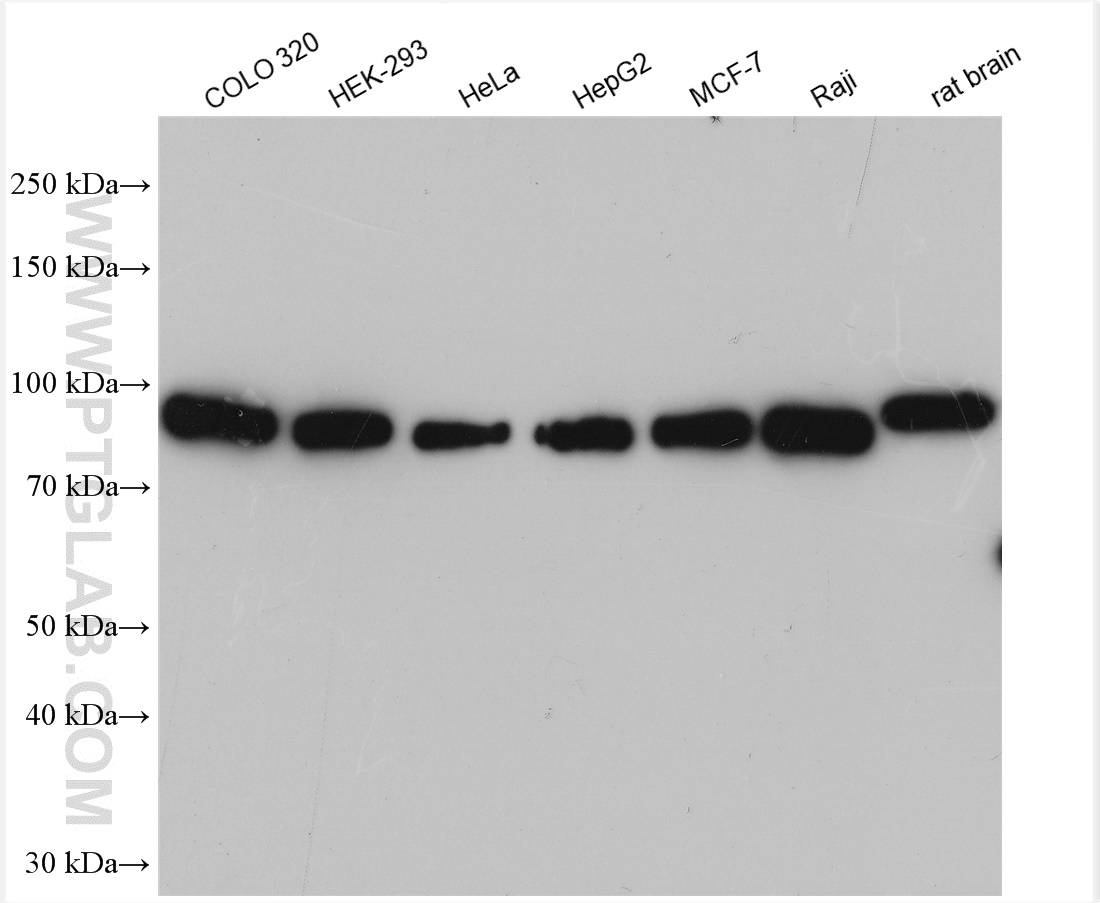 | Positive WB detected in | COLO 320 cells, HepG2 cells, HEK-293 cells, HeLa cells, Raji cells, mouse brain tissue, MCF-7 cells, rat brain tissue |