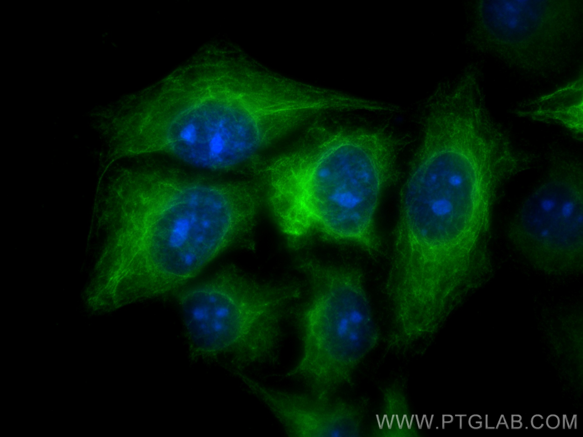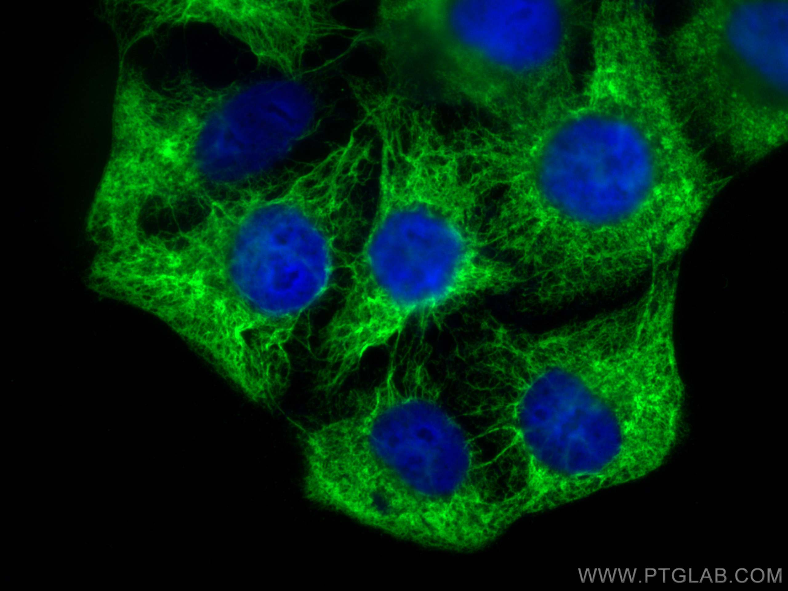 Immunofluorescent analysis of (-20°C Ethanol) fixed HepG2 cells using Cytokeratin 19 antibody (10712-1-AP) at dilution of 1:400 and CoraLite®488-Conjugated AffiniPure Goat Anti-Rabbit IgG(H+L).