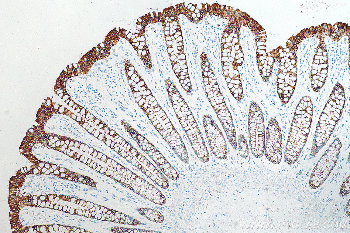 Immunohistochemical analysis of paraffin-embedded human colon tissue slide using 10712-1-AP (Cytokeratin 19 antibody) at dilution of 1:6000 (under 10x lens). Heat mediated antigen retrieval with Tris-EDTA buffer (pH 9.0).