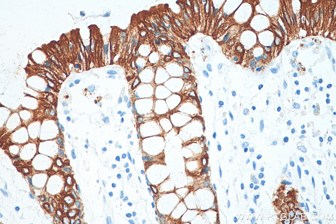 Immunohistochemical analysis of paraffin-embedded human colon tissue slide using 10712-1-AP (Cytokeratin 19 antibody) at dilution of 1:20000 (under 20x lens). Heat mediated antigen retrieval with Tris-EDTA buffer (pH 9.0).