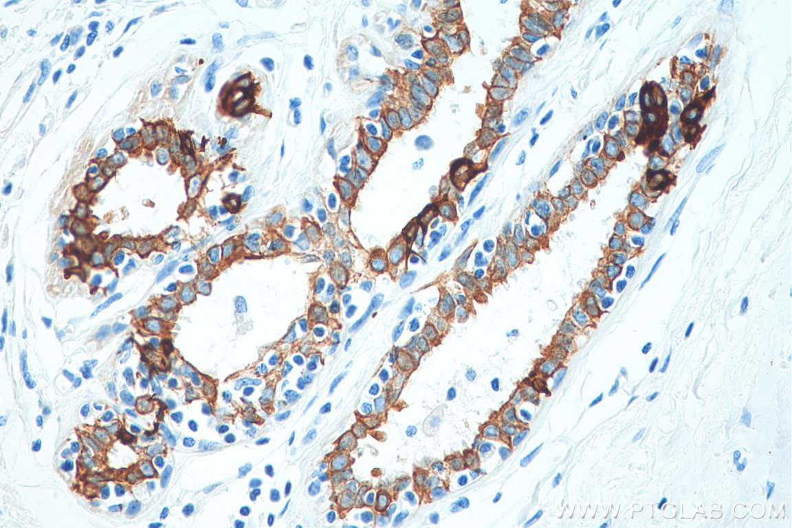 Immunohistochemical analysis of paraffin-embedded human breast cancer tissue slide using 10712-1-AP (Cytokeratin 19 antibody) at dilution of 1:6000 (under 40x lens). Heat mediated antigen retrieval with Tris-EDTA buffer (pH 9.0).